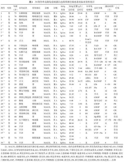 我院收治的3例患者分别以右眼肿痛、咽喉肿痛、腹部包块为首发症状。除1例确诊后出院失访,另2例患者接受CHOP(环磷酰胺、多柔比星、长春新碱、泼尼松)方案化疗4~6个疗程,分别获得PR、CR;血浆McIg水平下降17.6%、65.6%;随访6个月、6年,McIg持续存在,其中1例患者淋巴瘤本病一直处于稳定期,持续伴原发免疫性血小板减少症(primary immune thrombocytopenia, ITP),小剂量激素治疗可维持较高血小板水平。以上3例患者及文献报道的36例患者资料见表1。