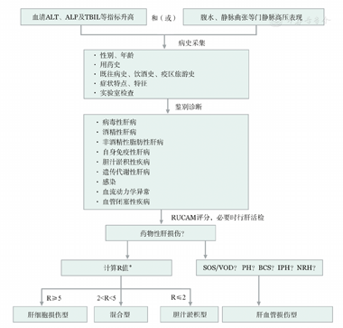TBIL:总胆红素;SOS/VOD:肝窦阻塞综合征/肝静脉闭塞病;PH:紫癜性肝病;BCS:巴德-基亚里综合征;IPH:特发性门静脉高压症;NRH:结节性再生性增生;*R=(ALT实测值/ULN)/(ALP实测值/ULN)