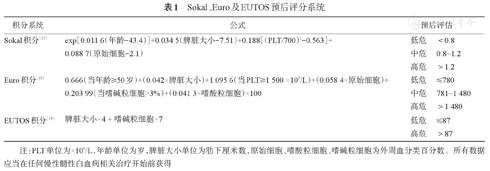 | Sokal积分[17] | exp[0.011 6(年龄-43.4)]+0.034 5(脾脏大小-7.51)+0.188[(PLT/700)2-0.563]+0.088 7(原始细胞-2.1) | 低危 | <0.8 |