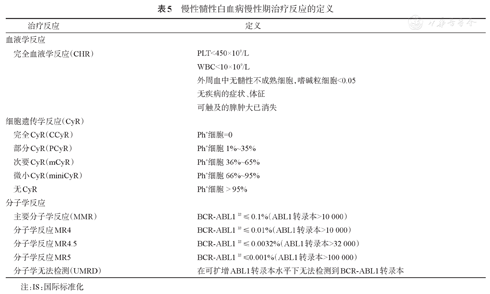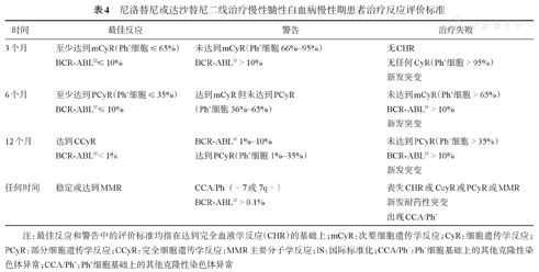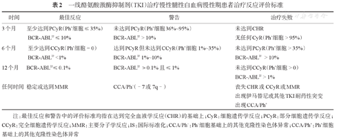 注:最佳反应和警告中的评价标准均指在达到完全血液学反应(CHR)的基础上;mCyR:次要细胞遗传学反应;CyR:细胞遗传学反应;PCyR:部分细胞遗传学反应;CCyR:完全细胞遗传学反应;MMR主要分子学反应;IS:国际标准化;CCA/Ph-:Ph-细胞基础上的其他克隆性染色体异常;CCA/Ph+:Ph+细胞基础上的其他克隆性染色体异常