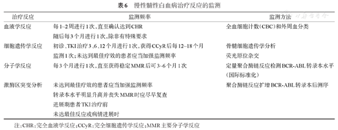 | 分子学反应 | 每3个月进行1次,直至获得稳定MMR后可3~6个月1次 | 定量聚合酶链反应检测BCR-ABL转录本水平(国际标准化) |