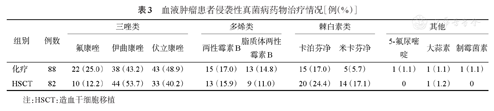 在88例确诊/临床诊断IFD的化疗患者中,应用抗真菌药物的中位时间为21 (3~158) d;而82例HSCT后确诊/临床诊断IFD患者应用抗真菌药物的中位时间为37 (4~139) d(P<0.001)。化疗患者采用1种抗真菌药物的患者为40例(45.5%),联合或序贯应用2~4种抗真菌药物的患者为48例(54.5%);而HSCT患者中采用1、2~4种抗真菌药物的例数分别为32例(39.0%)、50例(61.0%),差异无统计学意义(P=0.397)。患者应用抗真菌药物分布情况见表3,其中三唑类药物是最常用的抗真菌药物。