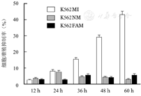 转染24、36、48、60 h,K562MI组细胞增殖抑制率均高于K562NM、K562FAM组(P <0.05 )。随着时间延长,K562MI组细胞增殖抑制率逐渐增高( P<0.05 ),由转染24 h的(8.1±0.9)%升至60 h的(43.1±2.1)%,表明靶向抑制miRNA-21可以抑制K562细胞增殖。K562NM、K562FAM两组随着时间延长细胞增殖抑制率无明显变化(P>0.05 )。详见图2。