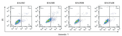 K562MI组:转染miRNA-21抑制物;K562NM组:转染随机序列对照(长度与miRNA-21抑制物相同);K562FAM组:转染荧光素FAM对照