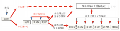 危险度分层是治疗的关键,划分t(8;21)AML的危险度主要依据两个指标:治疗前c-KIT是否突变和治疗后MRD的动态变化。高危复发患者包括c-KIT突变者、巩固治疗2个疗程未获得主要分子学缓解(MMR)者、巩固治疗2个疗程获得MMR但随后丧失MMR者;其余为低危患者。