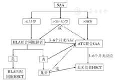 年龄≤35岁、有HLA相合同胞供者的重型或极重型AA患者;年龄超过35岁的重型AA患者,在ATG/ALG联合CsA治疗失败后,也可采用HLA相合同胞供者造血干细胞移植。