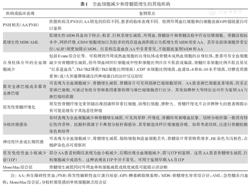 AA应与其他引起全血细胞减少的疾病相鉴别,见表1。AA属于BMF。BMF可以分为先天性和获得性两种,而获得性BMF又分为原发性和继发性。