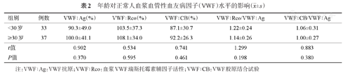 本组70名正常人中位年龄为30岁,以此为界分为两组。年龄<30岁组与≥30岁组VWF∶Ag、VWF∶Rco、VWF∶CB、VWF∶Rco/VWF∶Ag、VWF∶CB/VWF∶Ag差异均无统计学意义(P>0.05)。详见表2。