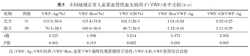 北方组VWF∶Ag、VWF∶CB高于南方组(t=4.525,P=0.001;t=3.214,P=0.002),VWF∶Rco/VWF∶Ag、VWF∶CB/VWF∶Ag比值均低于南方组(t=6.373,P=0.001;t=2.902,P=0.005),VWF∶Rco差异无统计学意义(P>0.05)。详见表5。