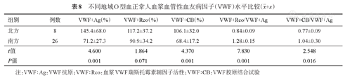 北方O型组正常人VWF∶Ag、VWF∶CB均高于南方O型组(t=4.600,P=0.001;t=4.340,P=0.001),VWF∶Rco/VWF∶Ag、VWF∶CB/VWF∶Ag比值均低于南方O型组(t=7.830,P=0.001;t=2.548,P=0.016),VWF∶Rco差异无统计学意义(P>0.05)。详见表8。
