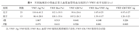 北方非O型血组VWF∶Rco/VWF∶Ag和VWF∶CB/VWF∶Ag比值均低于南方非O型血组(t=4.148,P=0.001;t=3.226,P=0.003),VWF∶Ag、VWF∶Rco、VWF∶CB差异均无统计学意义(P>0.05)。详见表9。