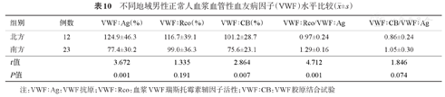 不同地域男性正常人血浆血管性血友病因子(VWF)水平比较(
