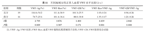 北方女性组VWF∶Ag高于南方女性组(t=2.795,P=0.009),VWF∶Rco/VWF∶Ag、VWF∶CB/VWF∶Ag比值低于南方女性组(t=4.439,P=0.001;t=2.842,P=0.008),两组间VWF∶Rco、VWF∶CB差异无统计学意义(P>0.05)。详见表11。