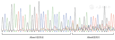 提取实验组NIH3T3细胞全基因组后,通过PCR扩增Aloxe3-Alox12b-Alox8基因簇缺失后形成的融合片段。将PCR产物直接进行Sanger测序,测序结果在Ensembl数据库(http://asia.ensembl.org)中进行匹配,结果显示Aloxe3-Alox12b-Alox8基因簇发生了缺失,Aloxe3基因前的片段和Alox8基因后的片段发生了融合(图4)。表明在sgRNA1和sgRNA2结合到小鼠11B3染色体上的靶位点后,Cas9核酸内切酶对靶位点进行切割,断裂后的DNA双链通过非同源重组末端连接修复了断裂的染色体,从而产生染色体大片段缺失。