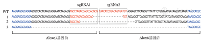 利用CRISPR-Cas9基因编辑技术可以有效实现小鼠染色体11B3上Aloxe3-Alox12b-Alox8基因簇的大片段缺失。