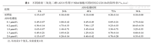 不同浓度三氧化二砷(ATO)作用于NB4细胞不同时间后CD11b的阳性率(%,
