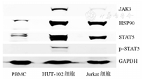 HTLV感染的ATL细胞株HUT-102细胞中,JAK3激酶作为HSP90的客体蛋白被异常活化,导致其下游信号蛋白p-STAT5异常持续性激活。17-AAG能显著下调JAK3、p-STAT5蛋白表达,抑制HUT-102细胞增殖、诱导凋亡。