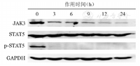 1 000 nmol/L 17-AAG作用0、3、6、9、12、24 h后,HUT-102细胞蛋白表达均下调。随着作用时间延长,JAK3蛋白表达水平逐渐降低,各组间差异有统计学意义(P<0.05)。在17-AAG作用≥3 h后p-STAT5蛋白均无明显表达,但总STAT5蛋白表达差异无统计学意义(P>0.05)。详见图3。