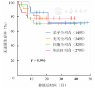 至随访终点,中位PFS时间为20(6~61)个月。亲子全相合、UD-HSCT、Sib-HSCT、Hi-HSCT组3年PFS率分别为(71.4±15.2)%、(70.8±9.3)%、(70.5±9.6)%、(77.8±8.0)%,差异无统计学意义(P=0.946)(图1)。