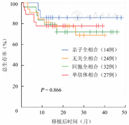 亲子全相合、UD-HSCT、Sib-HSCT、Hi-HSCT组中位随访时间分别为26.5(10~50)、24(7~53)、21(6~58)、18(6~61)个月,3年OS率分别为(85.7±9.4)%、(73.0±9.5)%、(70.2±9.6)%、(77.8±8.0)%,各组间3年OS率差异无统计学意义(P=0.866)(图2)。