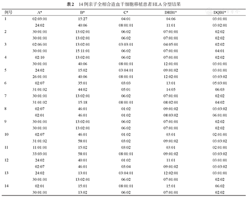 14例亲子全相合造血干细胞移植患者HLA分型结果