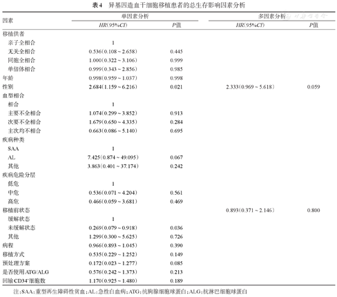 将疾病分为SAA、急性白血病和其他3类,移植物分是否为单纯外周造血干细胞,预处理方案分是否为改良Bu/Cy方案,单因素分析显示,性别(P=0.041)、疾病种类(P=0.050)和移植前状态(P=0.021)是PFS的影响因素,多因素分析显示以上因素对PFS均无影响(P=0.243,P=0.080,P=0.870),详见表3。性别(P=0.021)、移植前状态(P=0.036)也是OS的影响因素,但多因素分析显示以上因素对OS均无影响(P=0.059,P=0.800),详见表4。