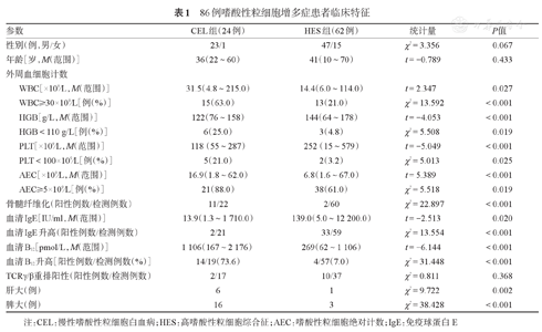 以2009年1月至2018年1月期间在我院就诊的86例嗜酸性粒细胞增多症患者为研究对象,其中包括24例CEL患者和62例HES患者。CEL患者中19例伴FIP1L1-PDGFRA重排,3例伴FGFR1重排,2例伴PDGFRB重排。诊断参照2008年WHO造血与淋巴组织肿瘤分类标准[1]。HES的诊断标准:外周血嗜酸性粒细胞计数≥1.5×109/L,持续6个月以上(有器官受累需要及早干预治疗的患者除外),伴有器官受累及功能异常,除外一切伴有继发性、反应性嗜酸性粒细胞增多的疾病[如过敏、寄生虫病、传染性疾病、Loeffler病和胶原病、T细胞淋巴瘤、霍奇金淋巴瘤、慢性髓性白血病、inv(16)/t(16;16)急性髓系白血病(AML)、骨髓增生异常综合征和骨髓增殖性肿瘤]。