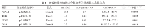在突变数据分析中,我们虽然筛除了目前较为明确的多态性位点,但在HES患者中发现了一些重现性的可能多态性位点,包括ASXL1 p.G652S(8例,13%)、TET2 p.F868L(3例,5%)、EP300 p.S507G(3例,5%)、DIS3 p.S587F(2例,3%)。我们将其与1000 genome的突变率进行对比分析,可以发现这些重现性点突变在HES患者的检出率及比值比(OR)较对照组显著增高(表4)。
