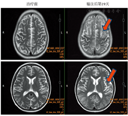 治疗前患者头部MRI未见明显异常;输注后第19天可见两侧大脑皮层散在片状异常信号影