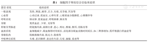 典型的CRS临床表现包括发热、乏力、厌食及腹泻等全身症状和心血管、呼吸道、肝肾、胃肠道、血液和神经系统等局部脏器毒性症状(表1)。实验室可检测到患者血清IL-6、IL-2、IL-10、IL-8、IFN-γ、IL-1β、TNF-α和GM-CSF等多种细胞因子浓度的增高,其中以IL-6、IL-10和IFN-γ的增高最为显著[5,6,7,8]。除此以外,实验室还可检测到类似噬血细胞淋巴细胞增多症/巨噬细胞活化综合征(hemophagocytic lymphohistiocytosis/macrophage activation syndrome, HLH/MAS)的异常指标:血清铁蛋白、转氨酶、LDH和三酰甘油水平的增高,低纤维蛋白原血症等[7,9]。