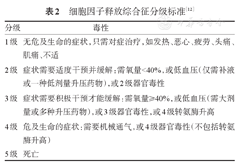 CAR-T细胞治疗相关CRS的分级目前临床上主要是根据Lee等[12]对免疫治疗所致CRS相关不良事件评估标准(NCI CTC AE 4.0)加以修正以适用于T细胞治疗所致CRS的评估标准进行评定(表2)。