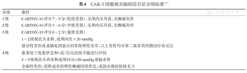 Juno和Kite两家世界领先的CAR-T细胞公司在临床试验中先后连续发生患者因神经毒性死亡的事件,引起研究者对于CAR-T细胞所致神经细胞毒性的高度重视。最近刚成立的美国CAR-T细胞治疗相关毒性(CAR-T-cell-therapy-associated TOXicity;CARTOX)工作小组[17]也为此提出了针对CRES的分级标准,从评估患者神经功能、有无颅内压增高、有无癫痫发作或肢体无力三个方面将CRES分为1~4级(表4)。对患者神经功能的评估可通过CARTOX-10(总分10分为认知功能正常者)进行评分,具体包括询问患者年、月、城市、所在医院名称和国家领导人姓名(共5分),命名三个对象:如时钟、笔和按钮(最多3分);写一个完整的句子,如"我的名字是XXX"(1分);从100开始以10为间隔倒数计数(1分)。