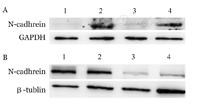 A:细胞株N-cadhrein表达。1:HL-60细胞;2:THP-1细胞;3:Jurkat细胞;4:KG-1a细胞。B:慢病毒感染THP-1细胞后N-cadherin蛋白表达。1:空白对照组;2:阴性对照组;3:RNAi1组;4:RNAi2组