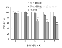 如图2所示,实验组与阴性对照组及空白对照组相比,随着培养时间延长,THP-1细胞的增殖受到明显的抑制,作用3~5 d时差异有统计学意义(P值均<0.05)。