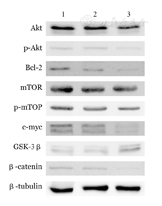 分别取5×105个细胞,用1 ml预冷1×PBS溶液洗涤细胞,重复3遍,4 ℃,2 000 r/min离心5 min(离心半径为10 cm),吸去上清,加入适量预冷1×PBS,再加入适量2×SDS细胞裂解液,吹打均匀,蛋白质变性后,聚丙烯酰胺凝胶电泳及转PVDF膜,50 g/L脱脂奶封闭PVDF膜,置于摇床上室温封闭1 h,弃去封闭液,加入稀释的一抗,室温孵育2 h。N-cadherin、Bcl-2、Akt、p-Akt、mTOR、p-mTOR、c-myc、GSK-3 β、β-catenin、β-tubulin蛋白抗体稀释比分别为1∶200、1∶500、1∶500、1∶200、1∶200、1∶200、1∶500、1∶500、1∶500、1∶1 500。用封闭液稀释各蛋白一抗对应的二抗(鼠二抗1∶3 000),室温下孵育1 h。洗涤后化学发光显色。GADPH或β-tubulin为内参照。