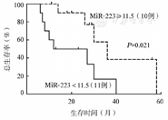 为了解miR-223表达水平对MCL患者的预后意义,我们以MCL患者组的miR-223中位表达水平(11.5)为阈值,将患者分为miR-223高表达组(10例)和低表达组(11例)进行生存分析,结果显示miR-223高表达组患者的OS时间明显较低表达组延长(36个月对12个月,P=0.021)(图1)。