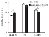 结果显示,miR-223过表达的Granta519细胞miR-223表达水平较对照组增高,miR-223过表达后可明显抑制MCL细胞的增殖(在培养96 h时最为明显),差异有统计学意义(P<0.01)(图2)。miR-223过表达时处于G2/M期的细胞明显减少,进入G0/G1期的细胞增多;miR-223过表达时细胞凋亡比例较对照组显著增高,差异有统计学意义(P值均<0.05)(图3)。