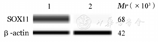 通过搜索数据库miRanda、Pictar、Targetscan和miRbase,我们发现SOX11的3′-UTR包含与miR-223完全匹配的序列。将MCL患者细胞和细胞系细胞提取物上样于SDS-PAGE胶进行分离,然后电转移至硝酸纤维素膜,50 g/L脱脂牛奶溶液封闭、PBST洗涤3次后,与抗SOX11(英国Abcam公司产品)、抗β-actin抗体(美国Santa Cruz公司产品)4 ℃孵育过夜。次日与偶联辣根过氧化物酶的二抗孵育后,进行蛋白条带显影。