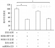 采用SPSS 20.0软件进行数据分析。由于临床标本中miR-223表达水平不符合正态分布,故使用非参数检验进行miR-223表达的比较。总生存(OS)时间定义为从诊断到死亡或失访的间隔时间。采用Kaplan-Meier方法绘制生存曲线,并应用Log-rank检验进行组间比较。功能实验及双荧光素酶报告基因实验均采用Student’s t检验进行分析。应用Spearman相关性评估临床标本中miR-223和SOX11的相关性。P<0.05为差异有统计学意义。