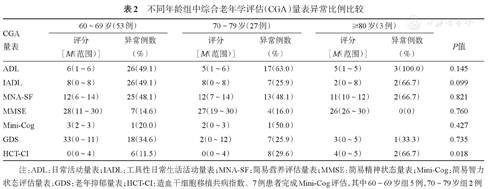 | CGA量表 | 60~69岁(53例) | 70~79岁(27例) | ≥80岁(3例) | P值 | |||