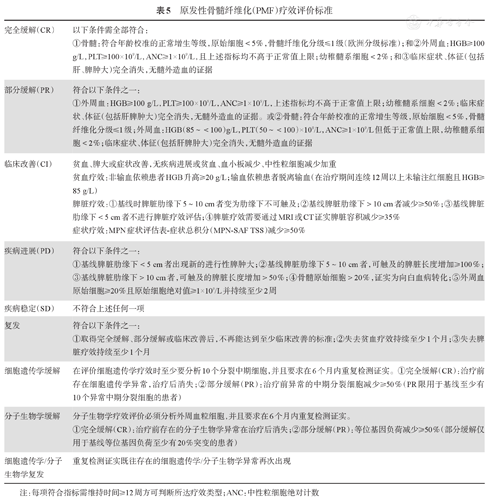 2005年欧洲骨髓纤维化网(EUMNET)提出的疗效判断标准从3个层面来进行疗效判断:临床血液学疗效、骨髓组织学疗效和细胞遗传学疗效。2006年骨髓增殖性肿瘤研究和治疗国际工作组(IWG-MRT)针对该疗效判断标准的不足,又提出了一个疗效判断标准[29]。本指南疗效标准采用2013年的EUMNET和IWG-MRT共识标准[30](表5)。