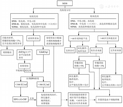 G-CSF/GM-CSF,推荐用于中性粒细胞缺乏且伴有反复或持续性感染的MDS患者。输血依赖的较低危组MDS患者可采用EPO±G-CSF治疗,治疗前EPO水平<500 IU/ml和红细胞输注依赖较轻(每月<8 U)的MDS患者EPO治疗反应率更高。