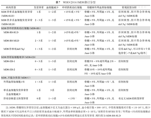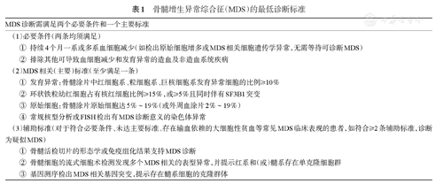 MDS的最低诊断标准见表1。其中血细胞减少的标准为:中性粒细胞绝对值<1.8×109/L,血红蛋白<100 g/L,血小板计数<100×109/L。
