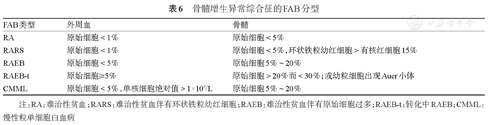 | 骨髓原始细胞(%) | <5 | 5~10 | - | 11~20 | 21~30 |