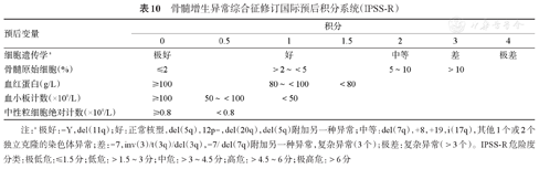 IPSS危险度的分级根据以下3个因素确定:骨髓原始细胞比例、血细胞减少的程度和骨髓细胞遗传学特征(表8)。