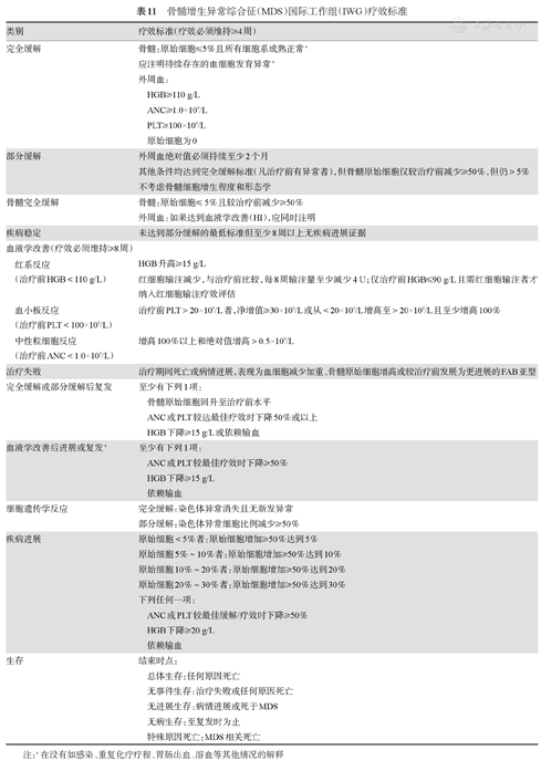 MDS国际工作组(International Working Group,IWG)于2000年提出国际统一疗效标准,2006年又进一步修订,使不同临床治疗方案结果间具有可比性。MDS的治疗反应包括以下四种类型:改变疾病的自然病程、细胞遗传学反应、血液学改善和改善生存质量(表11)。