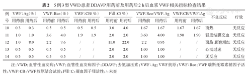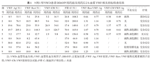 | 例号 | VWF∶Ag(%) | VWF∶Rco(%) | VWF∶CB(%) | FⅧ∶C(%) | VWF∶Rco/VWF∶Ag | VWF∶CB/VWF∶Ag | 不良反应 | 疗效 | ||||||
