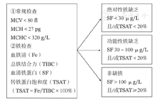 贫血常用的诊断标准有WHO标准[1]:年龄≥15岁,男性HGB<130 g/L,女性HGB<120 g/L,而中国标准[3]为男性HGB<120 g/L,女性HGB<110 g/L,孕妇HGB<100 g/L。缺铁性贫血诊断流程如图1。铁缺乏目前尚无统一的诊断标准,血清铁蛋白浓度<20 μg/L可诊断铁缺乏。