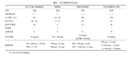 现有多种静脉铁剂可供使用,包括低分子右旋糖酐铁(iron dextran,ID)、羧基麦芽糖铁(ferric carboxymaltose,FCM)、蔗糖铁(iron sucrose,IS)和异麦芽糖酐铁(Iron isomaltosid)。所有这些铁剂在治疗缺铁方面都同等有效。主要的差别包括价格以及给予全部剂量所需要的就诊次数/治疗时间。常用静脉铁剂的比较见表1。