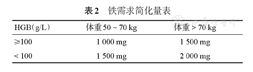 (1)缺铁性贫血补铁剂量计算:体重(kg)×(需达到的HGB-实际HGB)(g/L)×0.24+体内储备铁量(mg)